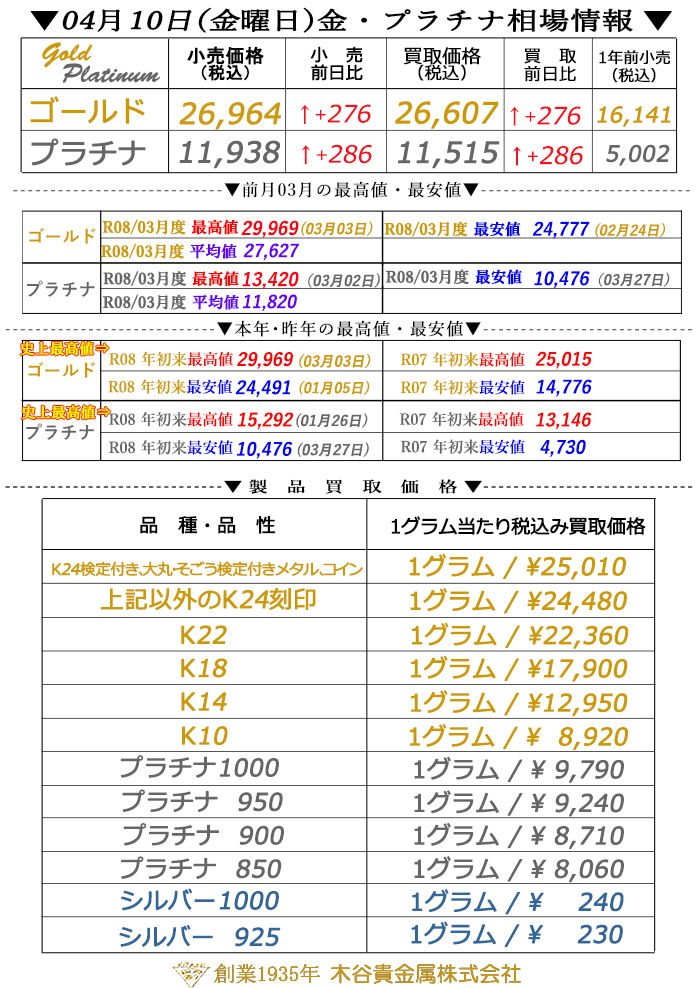 04月10日 (金)のゴールド&プラチナ 国内価格の相場と